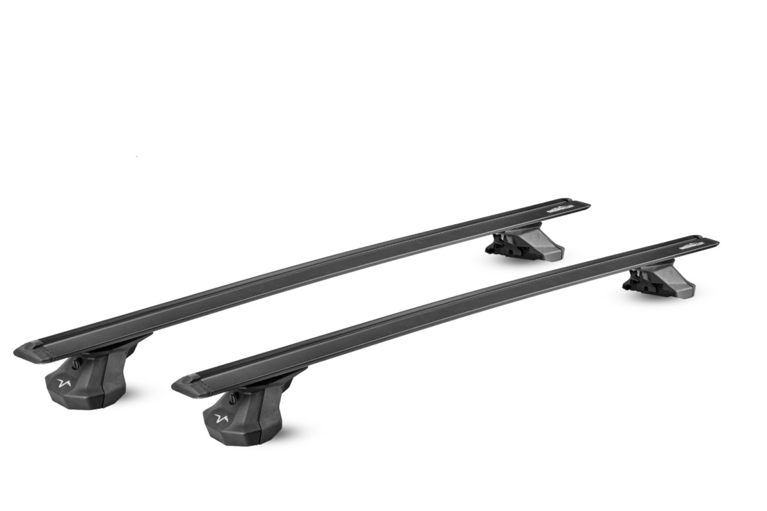 Pair of black painted aluminium crossbars with asymmetrical cross-section, 80 mm wide, reduces aerodynamic impact, noise and fuel consumption.