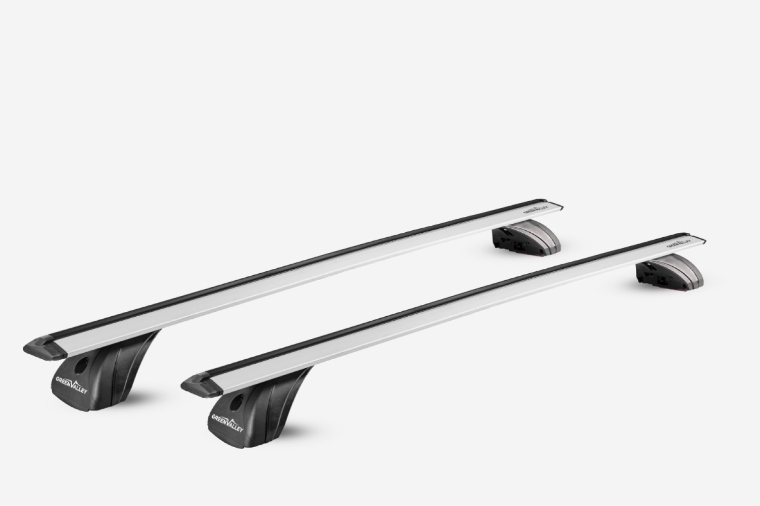 El par de barras transversales de aluminio oxidado de 80 mm de ancho y sección asimétrica reduce el impacto aerodinámico, el ruido y el consumo de combustible.